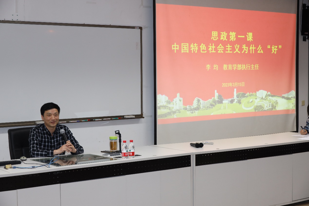 执行主任李均教授在汇德楼A103教室开讲主题为“中国特色社会主义为什么‘好’”的思政第一课,旨在引导同学们深入学习领会党的二十大精神,了解新时代新征程中国共产党的使命任务对于推动中国式现代化的重要意义。学部120余名本科生、研究生、教师全程参与。