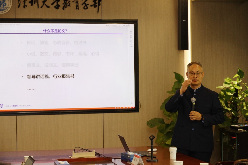 讲座伊始,李军首先进行了五点声明,确定了讲座内容和意义,并指出本场讲座的方式为比较法与“错中学”。接着李军教授通过提问互动,引导在场师生思考“什么是论文”这一问题,并引出论文的相关定义。
