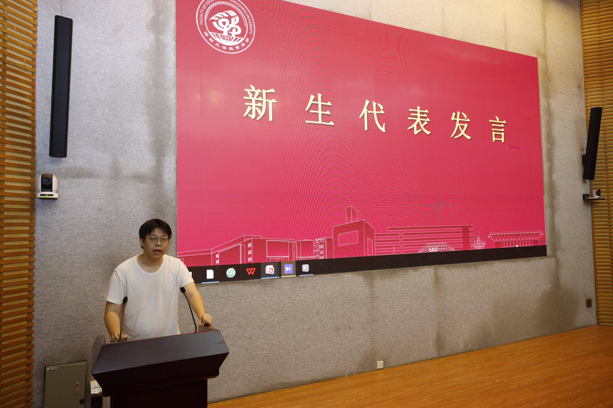2025级本科新生代表吴昌鸿发言。他回顾高考录取后的心路历程,深感教育专业承载着未来使命,连接着下一代打开知识大门的方式。选择教育专业,意味着不再停留于被动接收知识,更将主动成为学习生态的建构者、教育变革的推动者。